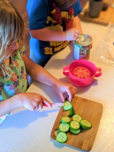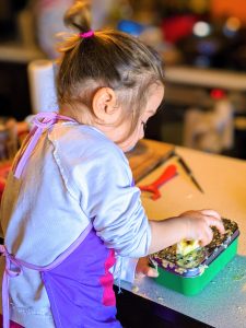 Nie wyjmuj wszystkich składników na blat roboczy. Wspólne gotowanie to także nauka tego gdzie co leży. Kiedy dzieci gotują ważne by wiedziały gdzie mogą znaleźć odpowiednie składniki. To wspiera ich samodzielność w kolejnych etapach rozwoju i zdobywania umiejętności kulinarnych.